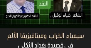 دراسة نقدية حديثة لقصيدة (بغداد الثكلى).. 18 أكتوبر, 2025 0 سيمياء الخراب وميتافيزيقا الألم في قصيدة بغداد الثكلى دراسة نقدية حديثة لقصيدة الشاعر ضياء الوكيل بقلم الأستاذ الدكتور الناقد عبدالكريم الحلو.. أكمل القراءة »